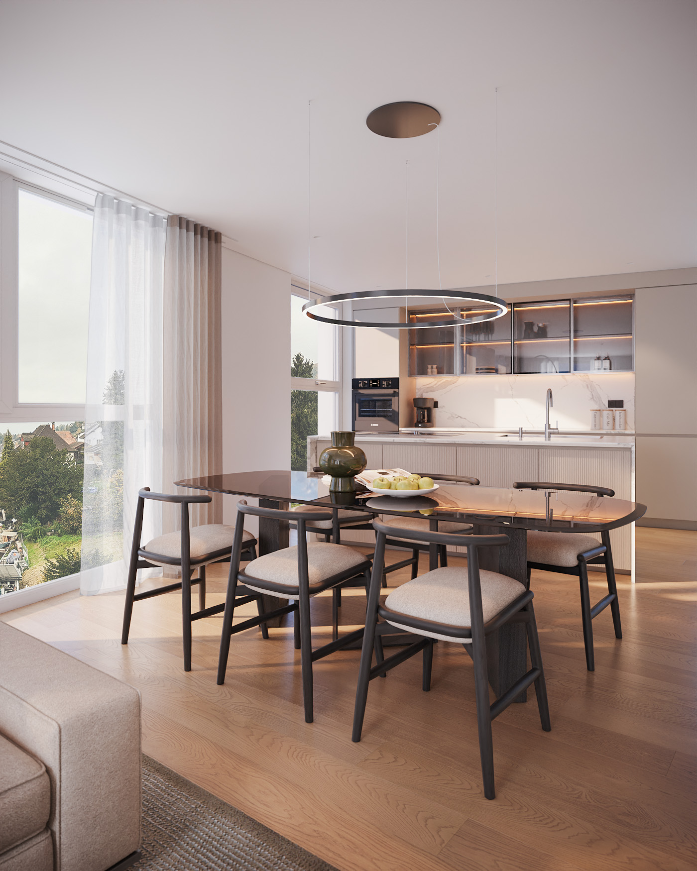 Das Gebäude fügt sich harmonisch in die Umgebung ein. Fassaden in warmen Grautönen (RAL 7044) mit anthrazitfarbenen Akzenten (RAL 7048) schaffen eine elegante, zeitlose Erscheinung. Grosszügige Fensterfronten lassen viel Licht in die Innenräume und eröffnen den Blick ins Grüne. Hochwertige Materialien, offene Wohn- und Essbereiche sowie moderne Küchen verbinden Stil und Komfort.